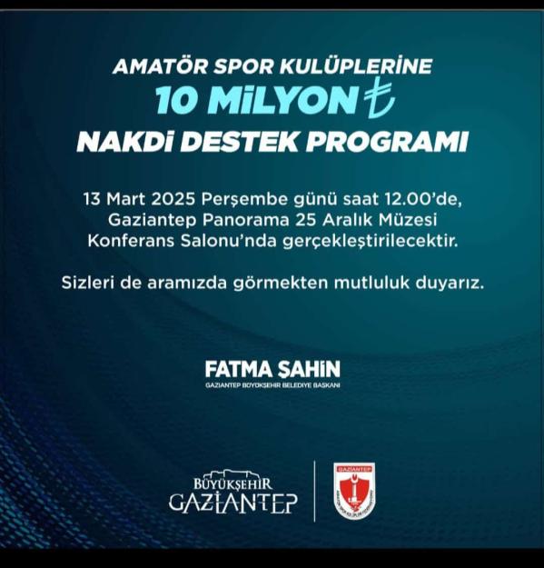 Spor şehri Gaziantep sloganıyla yola çıkan Gaziantep Büyükşehir Belediyesi amatör takımlara desteğini bu yıl da sürdürüyor. Büyükşehir Belediye Başkanı Fatma Şahin’in de katılacağı lansman toplantısı bugün gerçekleşiyor. Gaziantep Büyükşehir Belediyesi tarafından amatör spor kulüplerine destek olmak amacıyla “10 Milyon TL’lik Nakdi Destek Programı” 13 Mart 2025 Perşembe günü saat 12.00’da Panorama 25 Aralık Müzesi Konferans Salonu’nda düzenlenecek.